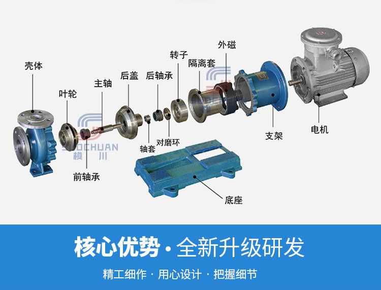 CQL型磁力驅(qū)動泵(簡稱磁力泵)是將永磁聯(lián)軸器的工作原理應(yīng)用于離心泵的新產(chǎn)品,設(shè)計合理,工藝先進、具有全密封、無泄漏、耐腐蝕等特點,其性能達到國外同類產(chǎn)品的先進水平。產(chǎn)品用途磁力泵結(jié)構(gòu)緊湊、外形美觀、體積小、噪音低、運行可靠、使用維修方便??蓮V泛應(yīng)用于化工、制藥、石油、電鍍、食品、電影照相洗印、科研機構(gòu)、工業(yè)等單位抽送酸、堿液、油類、稀有貴重液、毒液、揮發(fā)性液體,以及循環(huán)水設(shè)備配套、過濾機配套。特別是漏、易燃、易爆液體的抽送,選用此泵則更為理想。